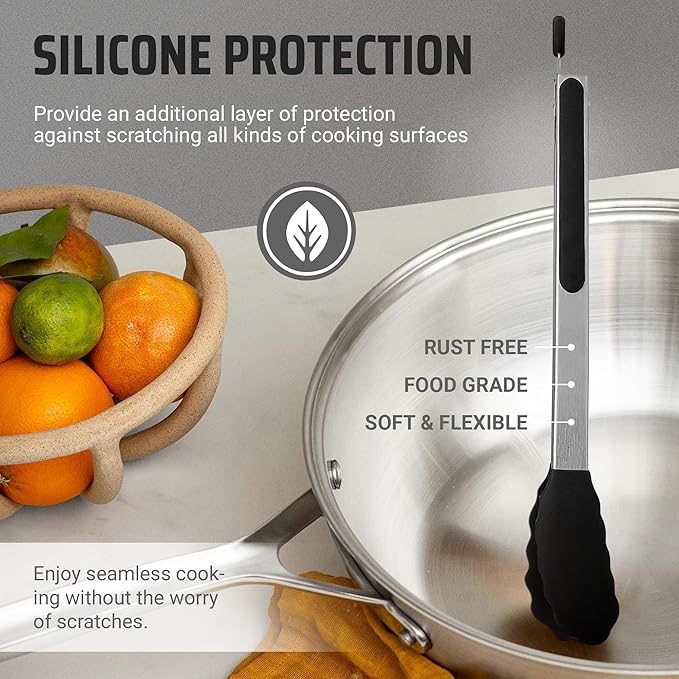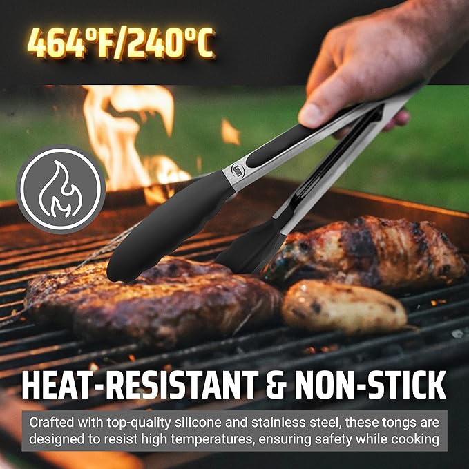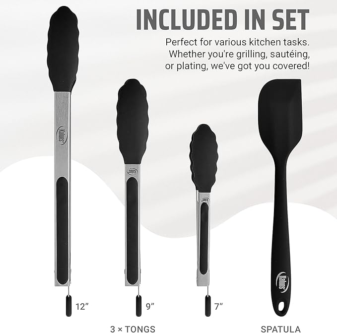 Kaluns Kitchen Tongs for Cooking Grilling Set of 4, BBQ Grill Tongs With Silicone Tip Stainless Steel Heat Resistant, Non-stick Pull Lock, Incl 7, 9, 12 Inch Tong Plus a Silicone Spatula