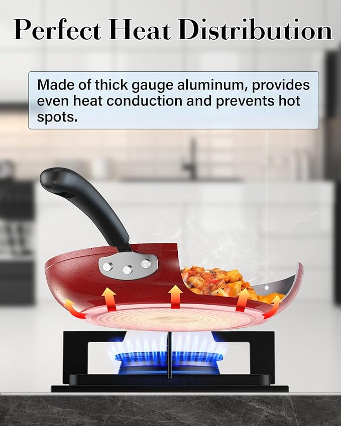 Cook N Home Nonstick Frying Pans Set 3 Piece, 8, 9.5, 11-Inch Kitchen Cooking Skillets Saute Fry Pan Induction Compatible, Marble Red