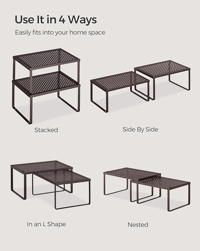 SONGMICS Spice Racks, Set of 4 Metal Cabinet Shelf Organizers, Countertop Organizers, Shelf Risers, Stackable, Expandable, Brown UKCS06BR