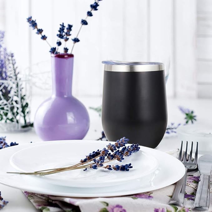 MEWAY 12oz/4 Pack Wine Tumbler Glasses with Lid - Stemless Double Wall Vacuum Stainless Steel Travel Tumbler - Keeping Cold & Hot for Wine,Coffee,Cocktails,Drinks-Family and Gifts (Black,Set of 4)