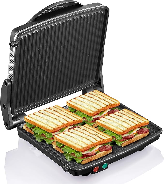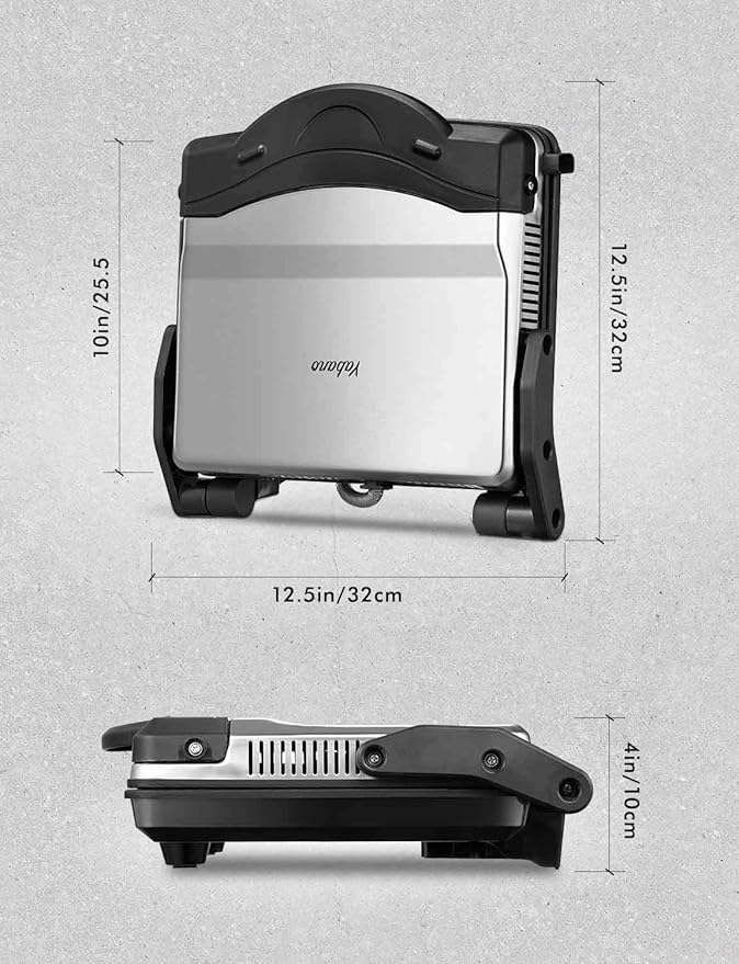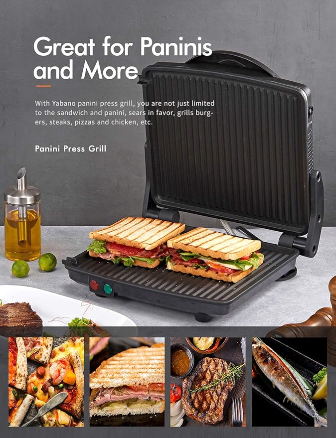 Panini Press Grill, Yabano Gourmet Sandwich Maker Non-Stick Coated Plates 11" x 9.8", Opens 180 Degrees to Fit Any Type or Size of Food, Stainless Steel Surface and Removable Drip Tray, 4 Slice