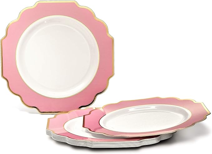 " OCCASIONS " 50 Plates Pack (25 Guests)-Heavyweight Wedding Party Disposable Plastic Plate Set -(25x10.5'' Dinner + 25x8'' Salad/Dessert) (Imperial in Rose Pink & Gold)