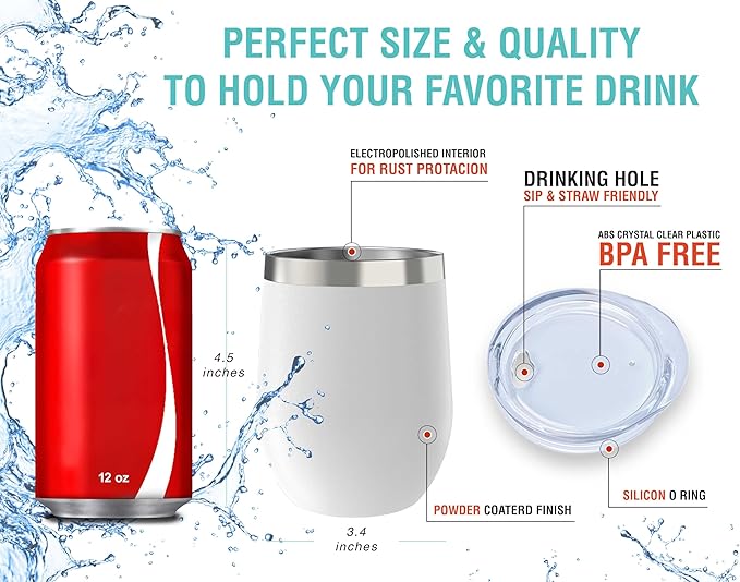 CHILLOUT LIFE 12 oz Stainless Steel Wine Tumblers 4 Pack - Double Wall Vacuum Insulated Wine Glasses Cups with Lids and Straws Set Keeping Cold & Hot for Coffee, Beer, Ice Cream - Powder Coated White