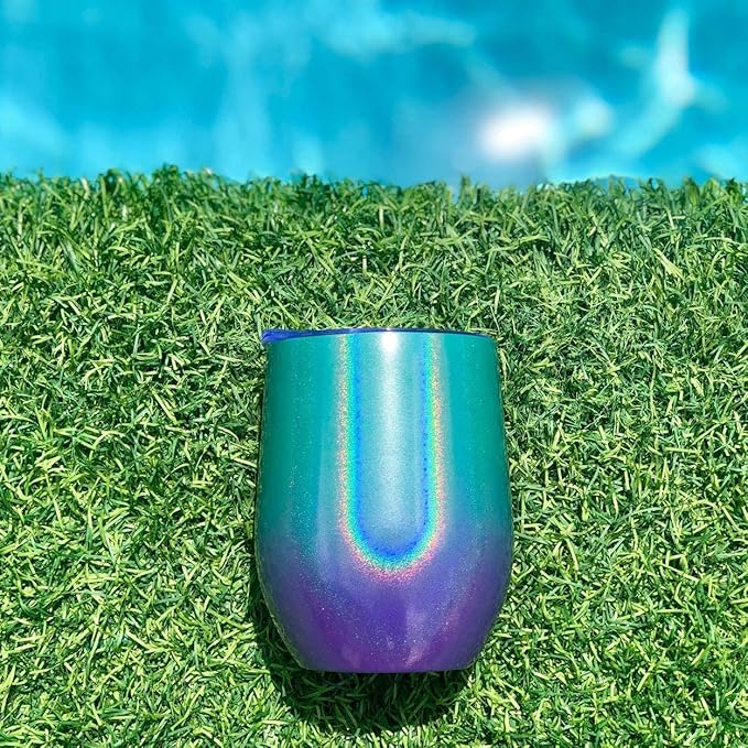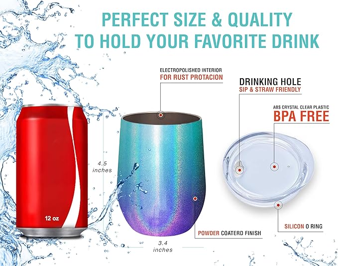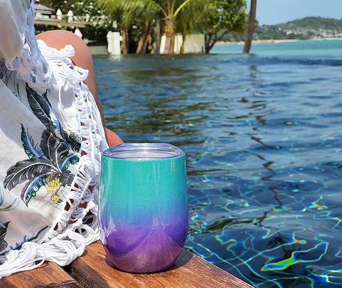 CHILLOUT LIFE 12 oz Stainless Steel Wine Tumblers 2 Pack - Double Wall Vacuum Insulated Wine Glasses Cups with Lids and Straws Set Keeping Cold & Hot for Coffee, Beer, Ice Cream - Mermaid Sparkle
