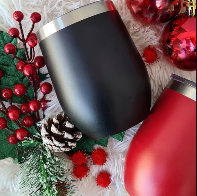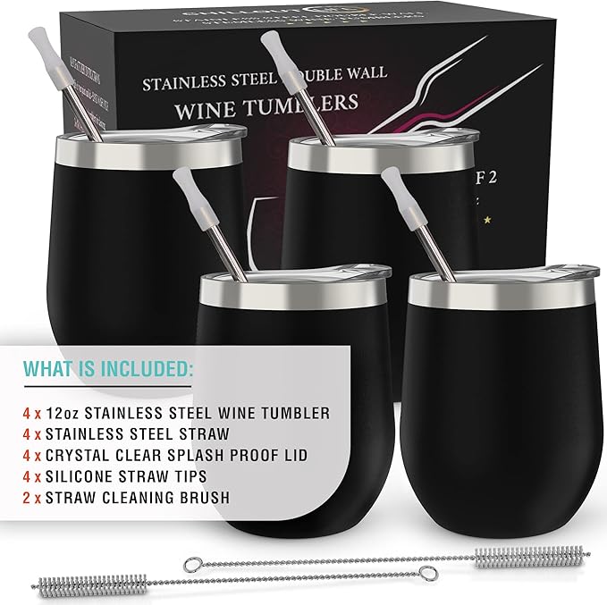 CHILLOUT LIFE 12 oz Stainless Steel Wine Tumblers 4 Pack - Double Wall Vacuum Insulated Wine Cups with Lids and Straws Set for Coffee, Wine, Cocktails - Powder Coated Black