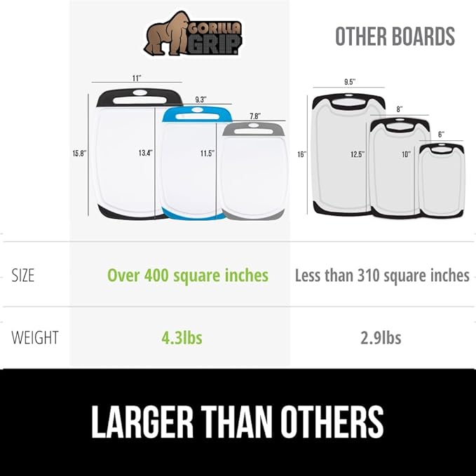 GORILLA GRIP BPA-Free Reversible Kitchen Cutting Board Set of 3, US Designed, Nonporous, Juice Grooves Catch Liquid, Slip Resistant Border, Dishwasher Safe Large Food Chopping Boards, Black Aqua Gray