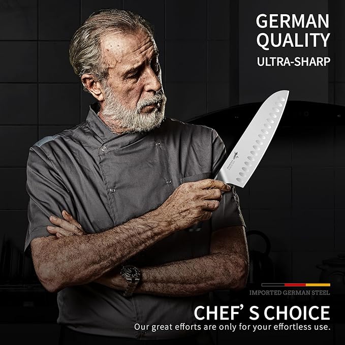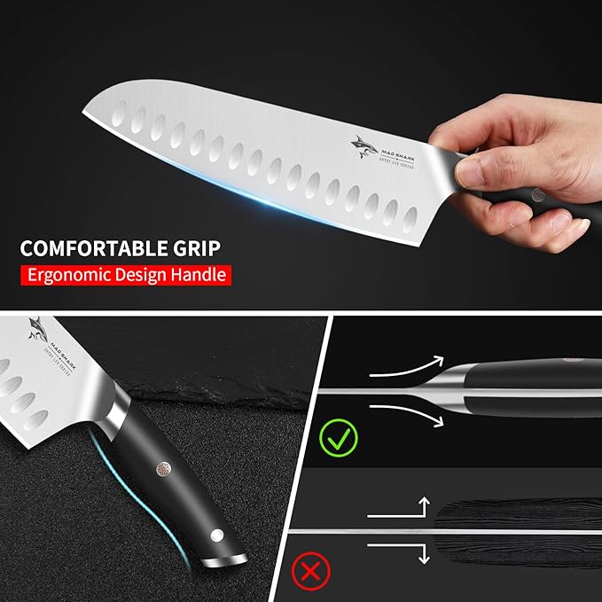 About This SANTOKU KNIFE'S HOLLOW EDGE DESIGN: This design reduces blade weight, easing strain for extended cooking. It improves cutting... Read more