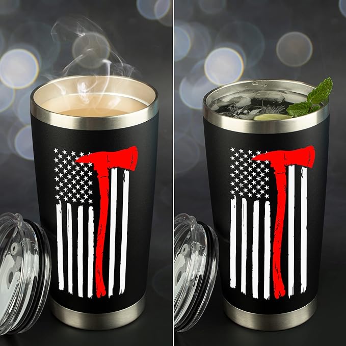 Firefighter Gifts for Men | Stainless Steel Travel Tumbler/Mug with Lid for Coffee Cup| Thin Red Line Flag Design for Fireman | Fire Department | First Responder Valentine's Day Gift (20oz Black)