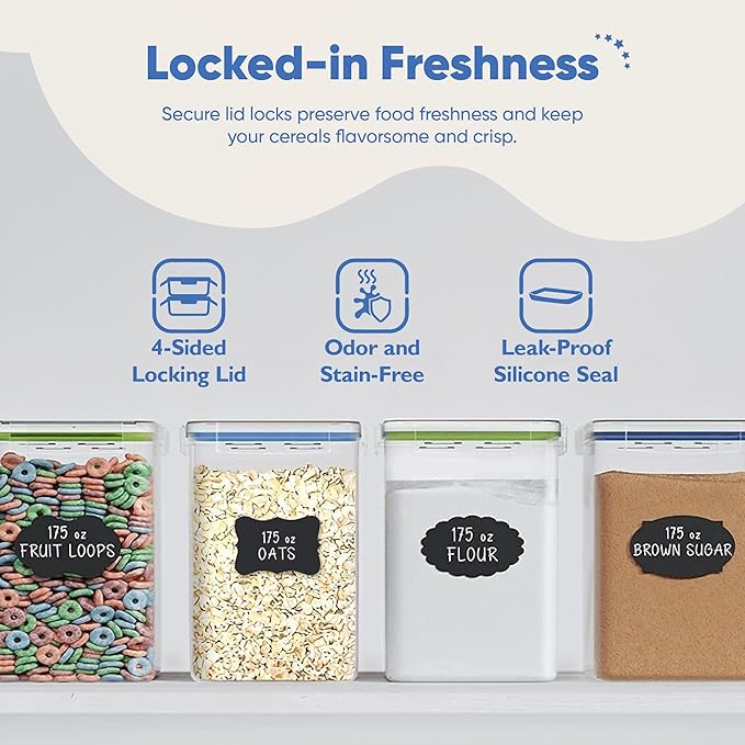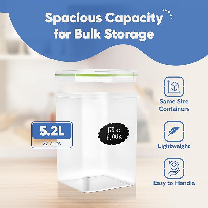 Chef's Path Kitchen Storage Box Set of 4 Extra Large Airtight Food Storage Jars for Sugar Flour Cereal Rice - Measuring Spoons, Pen and Food Preservation Labels (5.2 L)