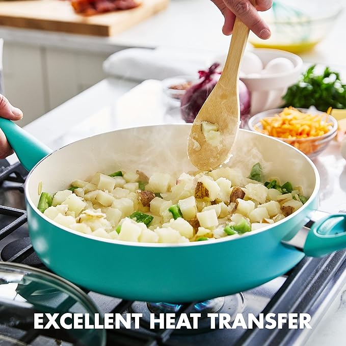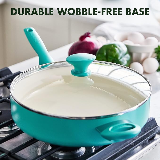 GreenPan Rio Healthy Ceramic Nonstick 5QT Saute Pan Jumbo Cooker with Helper Handle and Lid, PFAS-Free, Dishwasher Safe, Turquoise