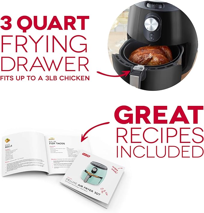 Dash Deluxe Electric Air Fryer + Oven Cooker with Temperature Control, Non-stick Fry Basket, Recipe Guide + Auto Shut off Feature, 1200-Watt, 3 Quart - Black