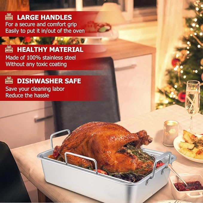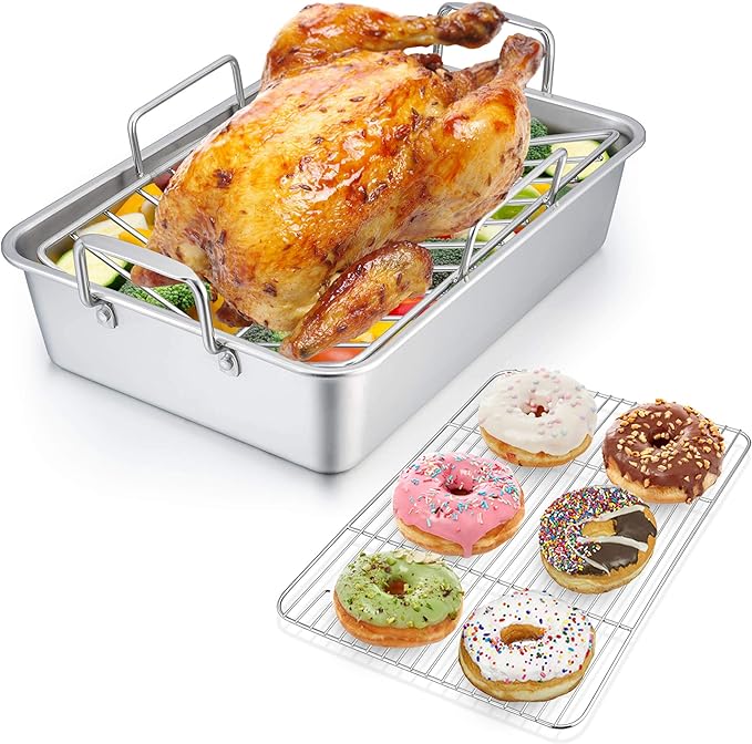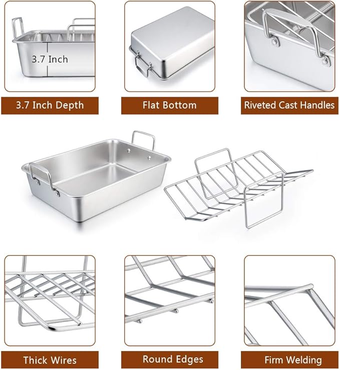 About This 【HEALTHY】Both the roasting pan and rack are made of 100% pure stainless steel without any toxic coatings, Great... Read more