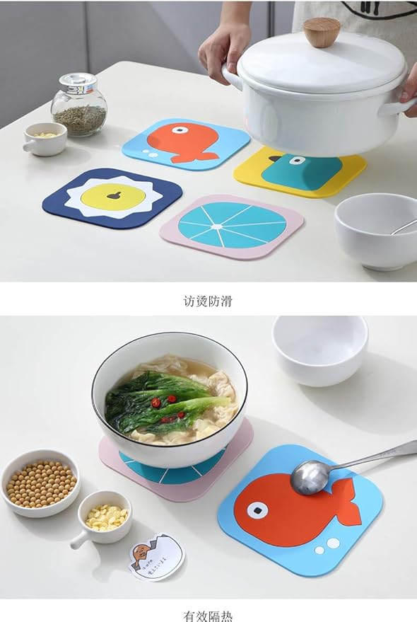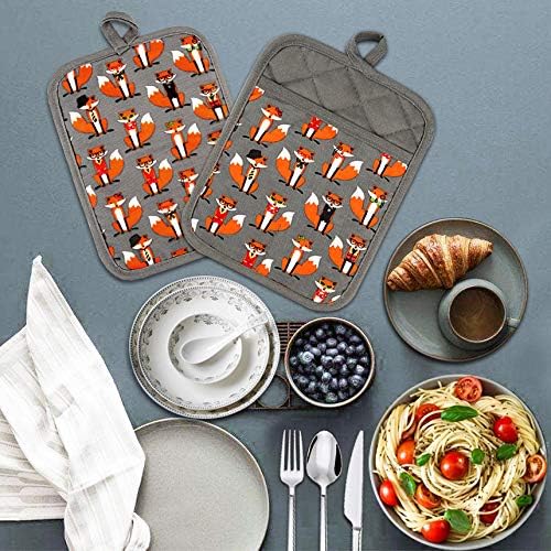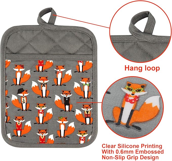 Pot Holders Set of 2 Heat Resistant 480 ℉ Non Slip Clear Silicone Printed Comfortable Cotton Lining Kitchen Women Men Cooking Baking Microwave Machine Washable (Fox, Gray Potholders)