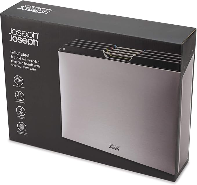Joseph Joseph Folio 4-Piece Colour coded Cutting Board Set, Stainless Steel Slimline case for organized Kitchen storage, Silver