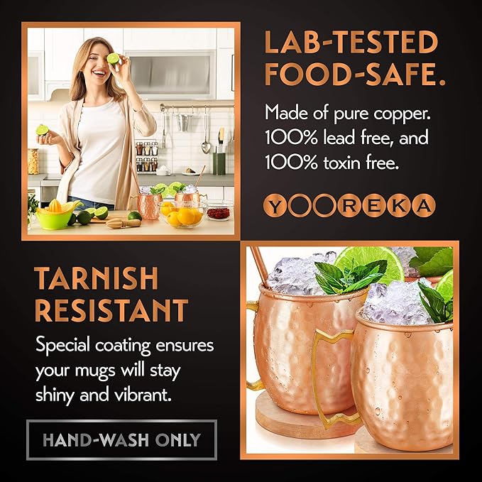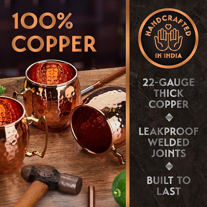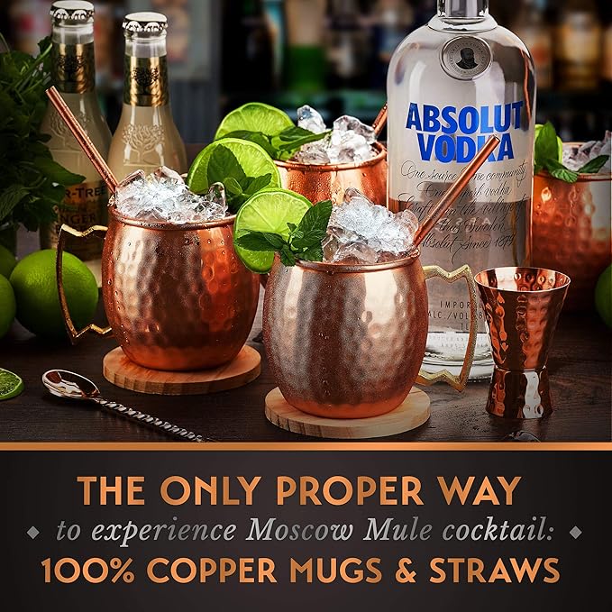 Moscow Mule Mugs - 100% Pure Copper for Drinking Beverages with Moscow Mule Cups Set of 4-16 oz Mugs, 4 Straws, 4 Coasters, Stirring Spoon, Shot Glass, Brush & Pure Copper Cup Gifts for Him