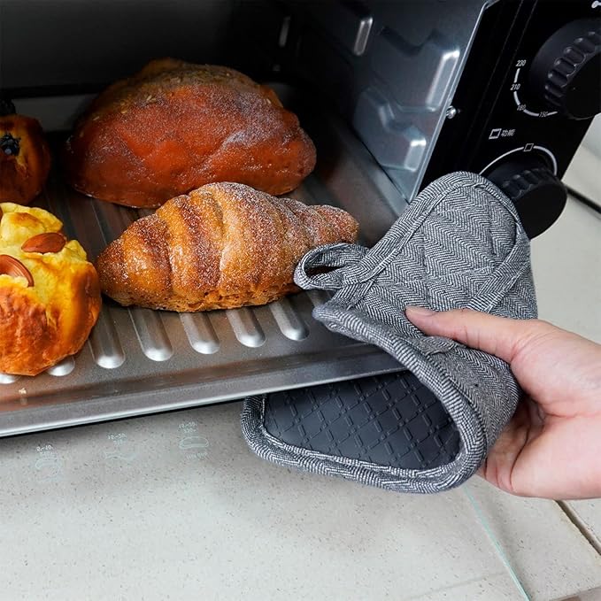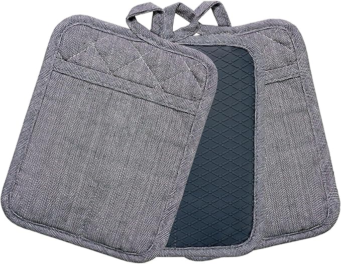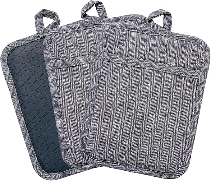 Pot Holders Yarn-Dyed Set of 3 Non Slip Silicone Kitchen Lines Heat Resistant 500℉ Kitchen Gloves BBQ Cooking Baking Women Men Cooking Barbecue Microwave Machine Washable (Gray Potholders)