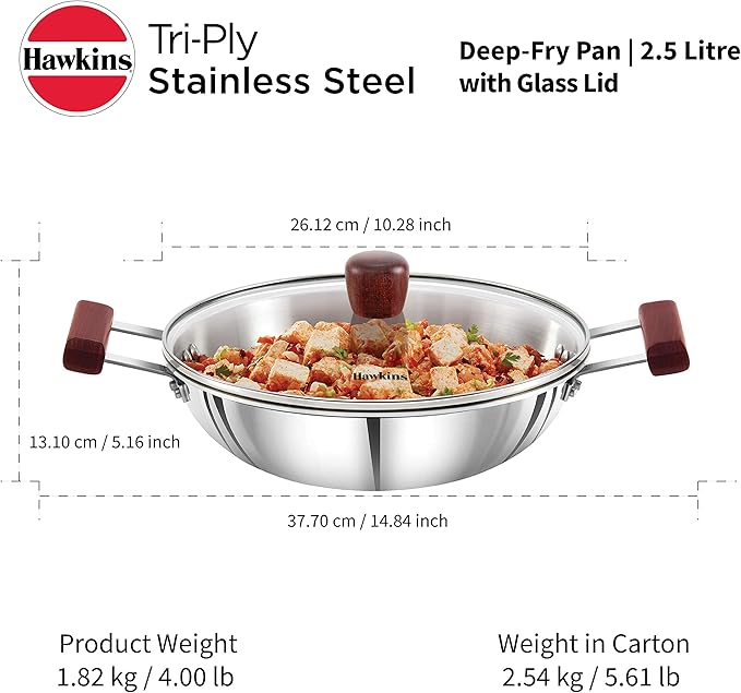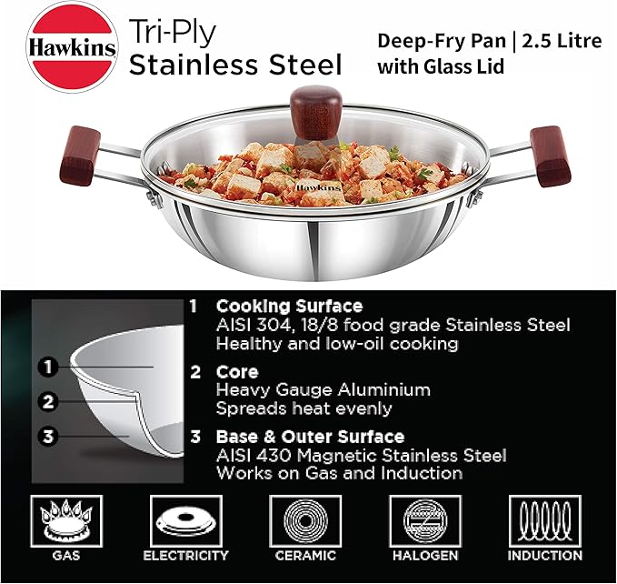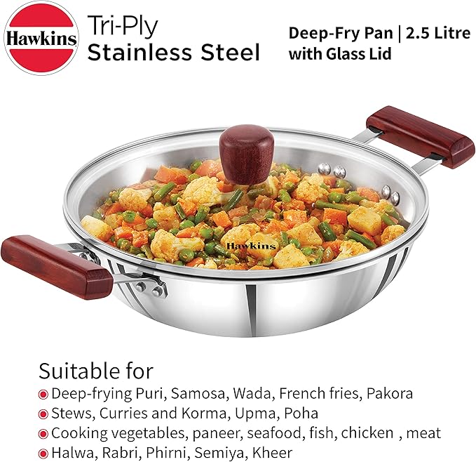 Hawkins 2.5 Litre Deep Fry Pan, Triply Stainless Steel Kadai with Glass Lid, Flat Bottom Induction Kadhai, Silver (SSD25G)