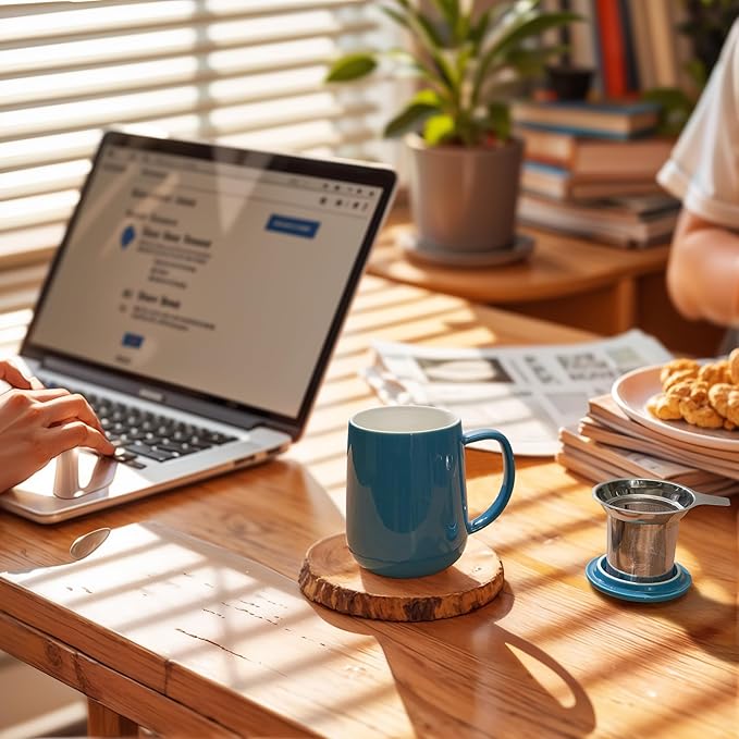 Sweese Porcelain Teacup with Infuser and Lid, 20oz, Steel Blue, Microwave Safe, Reusable