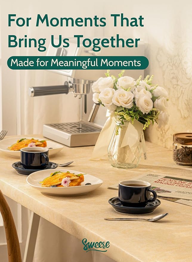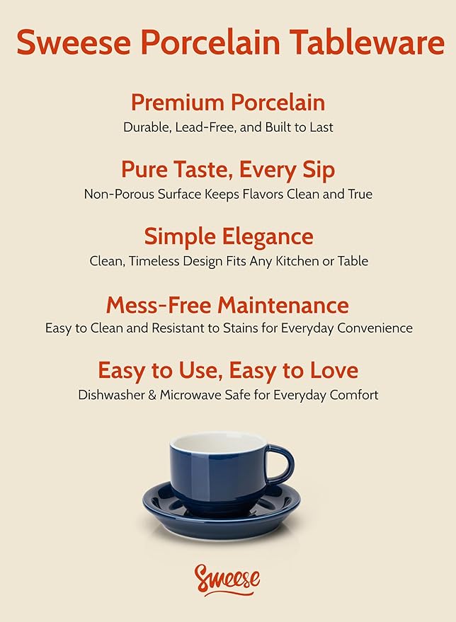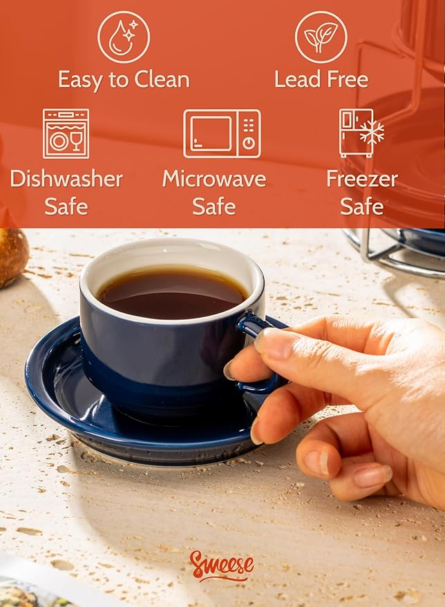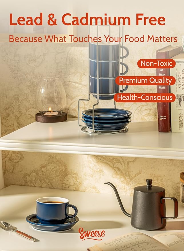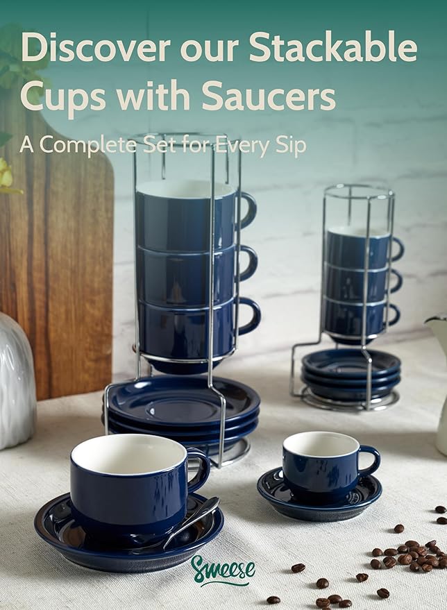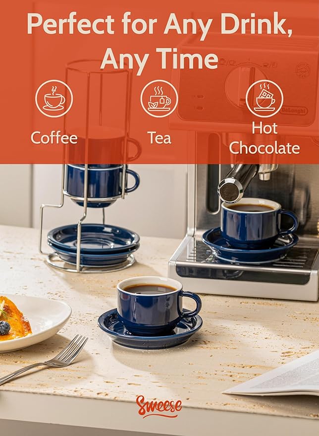 Sweese 8 Ounce Porcelain Stackable Cappuccino Cups with Saucers and Metal Stand - for Specialty Coffee Drinks, Cappuccino, Latte, Americano and Tea - Set of 4, Navy