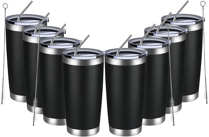 MEWAY 20oz Tumbler 8 Pack Double Wall Vacuum Insulated Travel Mug Bulk, Stainless Steel Tumblers with Lid and Straw, Durable Powder Coated Coffee Cups for Cold & Hot Drinks (Black, 8)