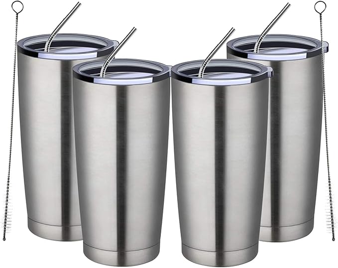 MEWAY 20oz Tumbler 4 Pack Double Wall Vacuum Insulated Travel Mug Bulk, Stainless Steel Tumblers with Lid and Straw, Durable Powder Coated Coffee Cups for Cold & Hot Drinks (Silver, 4)