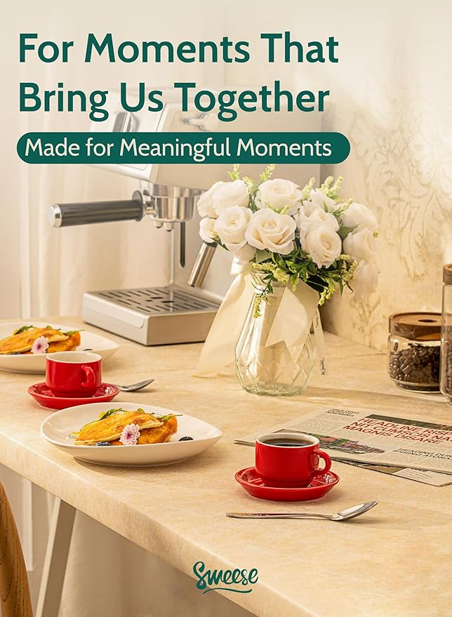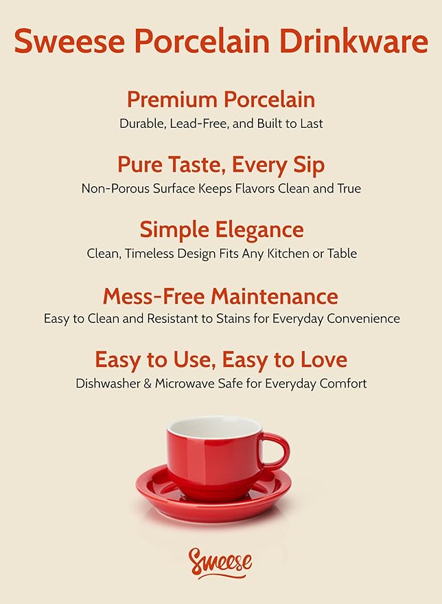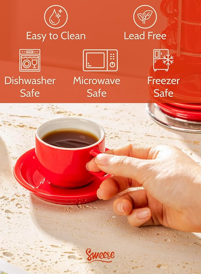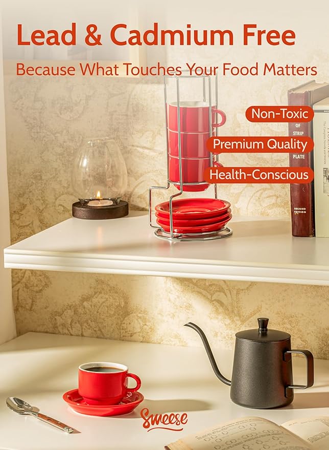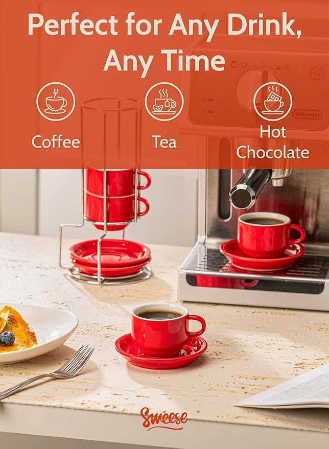 Sweese 2.5 Ounce Porcelain Stackable Espresso Cups with Saucers and Metal Stand Set of 4, Red