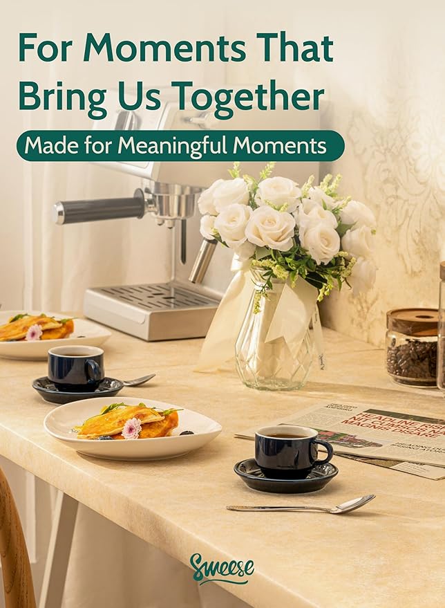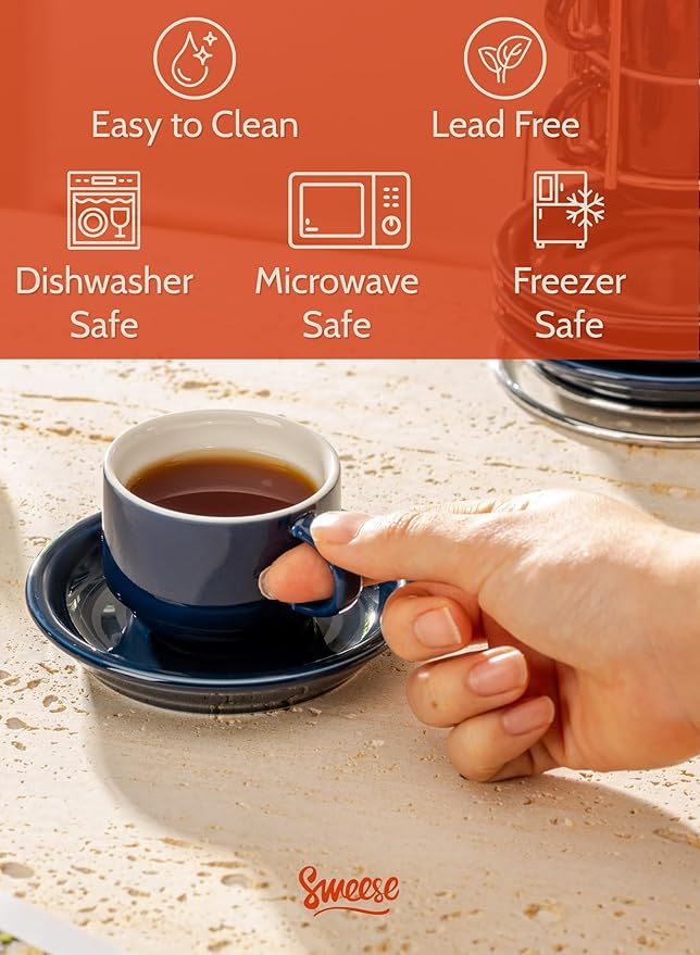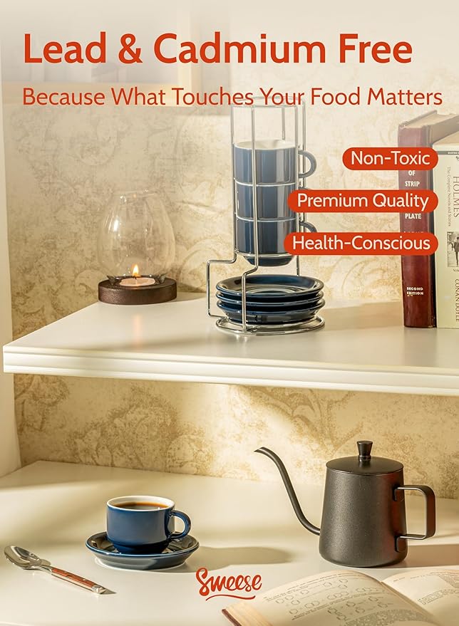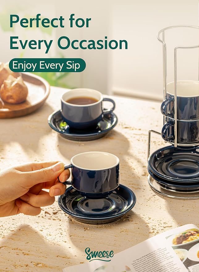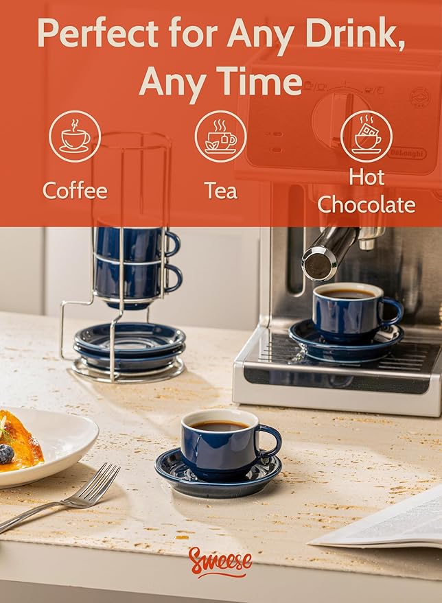 Sweese 2.5 Ounce Porcelain Stackable Espresso Cups with Saucers and Metal Stand Set of 4, Navy