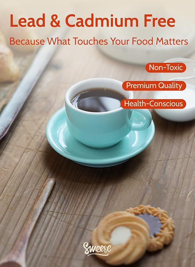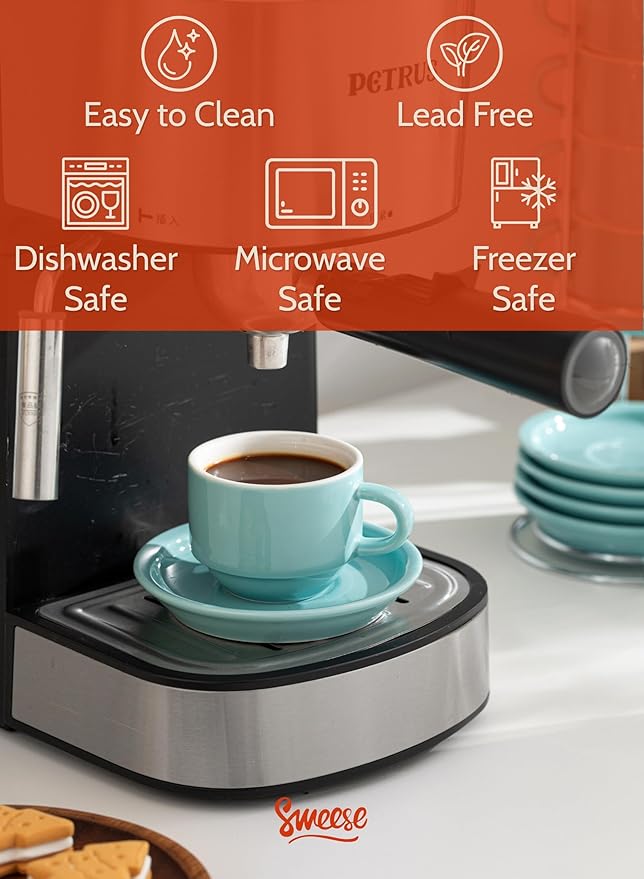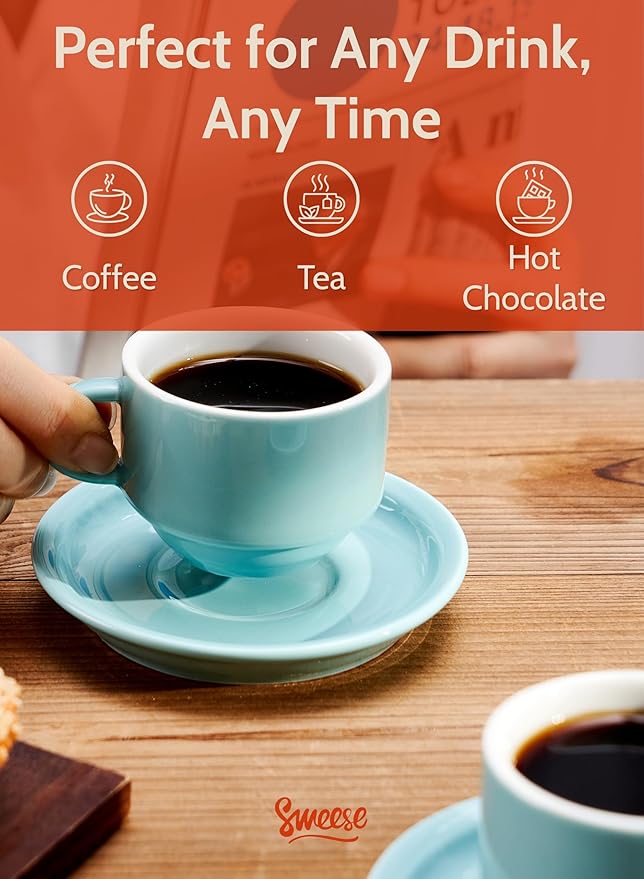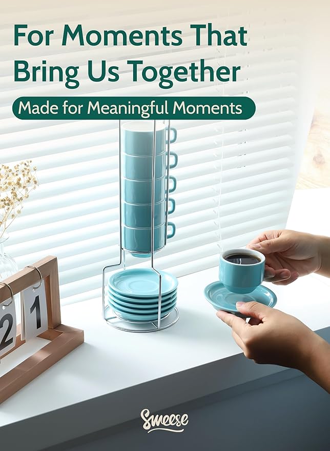 Sweese 2.5 Ounce Porcelain Stackable Espresso Cups with Saucers and Metal Stand Set of 4, Turquoise
