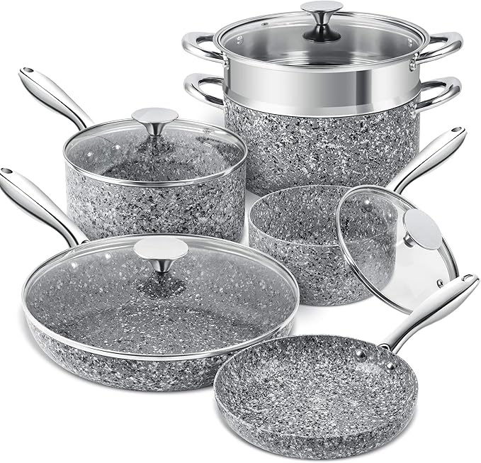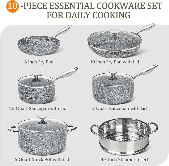 MICHELANGELO Stone Cookware Set 10 Piece, Ultra Nonstick Pots and Pans Set with Granite Coating, Kitchen Cookware Sets, Stone Pots and Pans Set, Granite Pots and Pans Set - 10 Piece