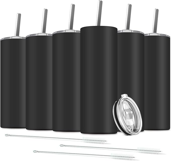 6 Pack Stainless Steel Skinny Tumbler, 20 OZ Double-Insulated Water Tumbler Cup with 6 Straw and 3 Brush, Vacuum Travel Mug Gift for Hot Cold Drinks with Cleaning(Black)