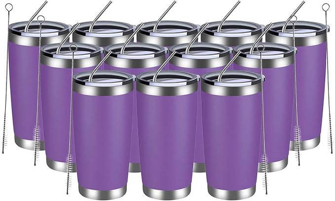 MEWAY 20oz Tumbler 12 Pack Double Wall Vacuum Insulated Travel Mug Bulk, Stainless Steel Tumblers with Lid and Straw, Durable Powder Coated Coffee Cups for Cold & Hot Drinks (Purple, 12)