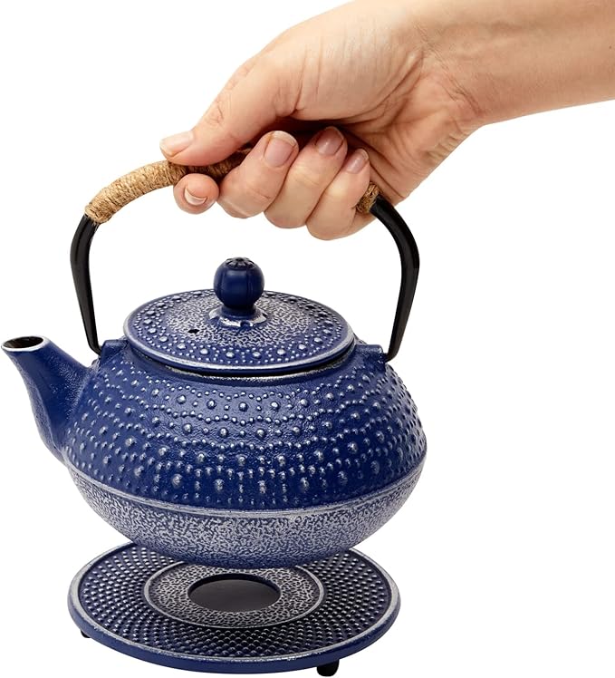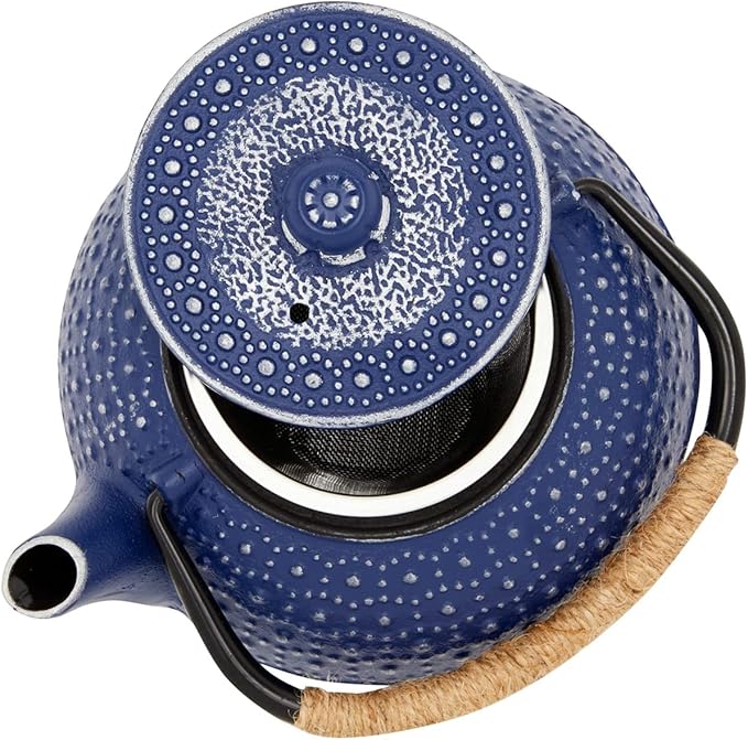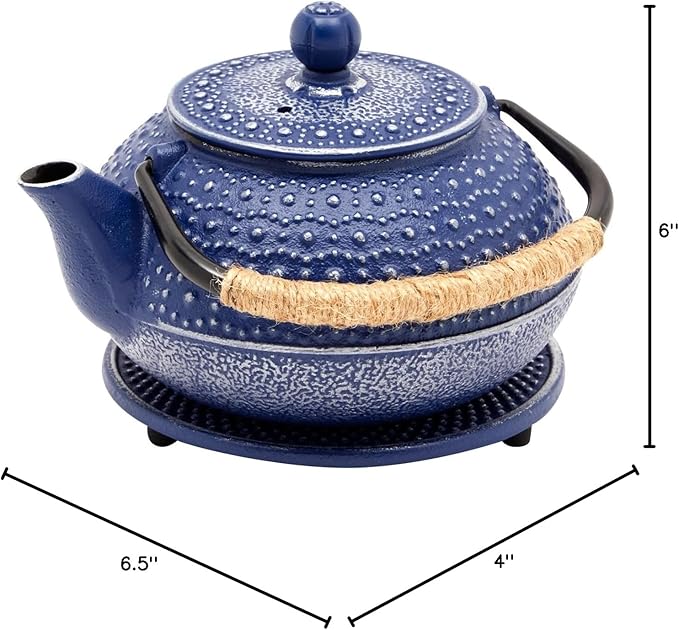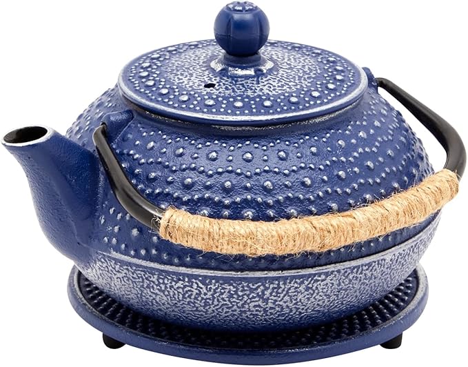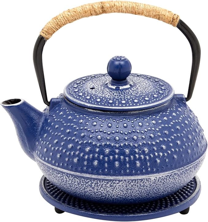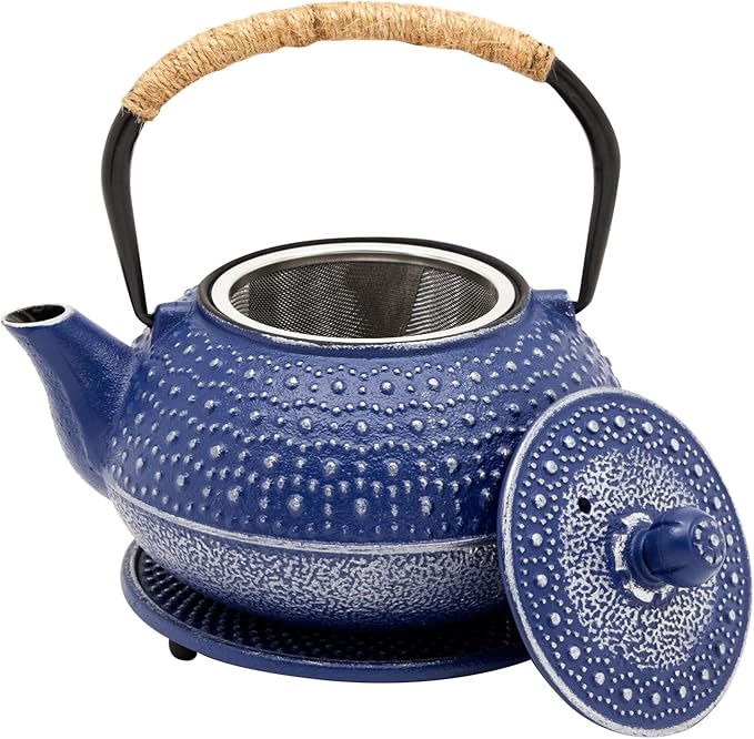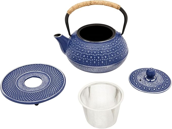 Juvale Cast Iron Teapot with Infuser - Blue, 27 oz (800 mL) - Stovetop Tea Kettle for Loose Leaf Tea - Includes Stainless Steel Infuser & Trivet