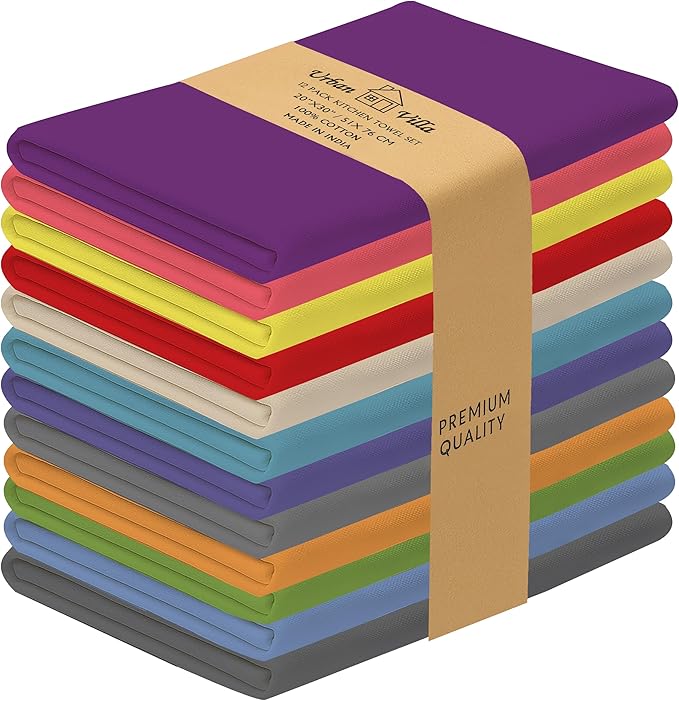 Urban Villa Kitchen Towels Set of 12 Dish Towels for Kitchen 100% Cotton Multi Color Dish Cloths 20''X30'' Large Multi-Purpose Kitchen Hand Towels Highly Absorbent Kitchen Towels with Hanging Loop