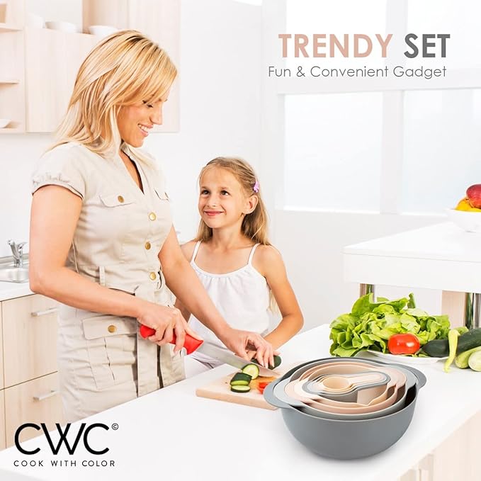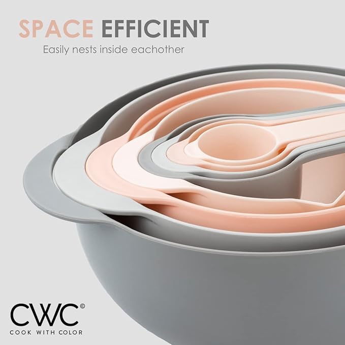 About This Set Includes two mixing bowls (insert size of mixing bowls), one colander/strainer, one fine-mesh sieve/sifter, and four measuring... Read more