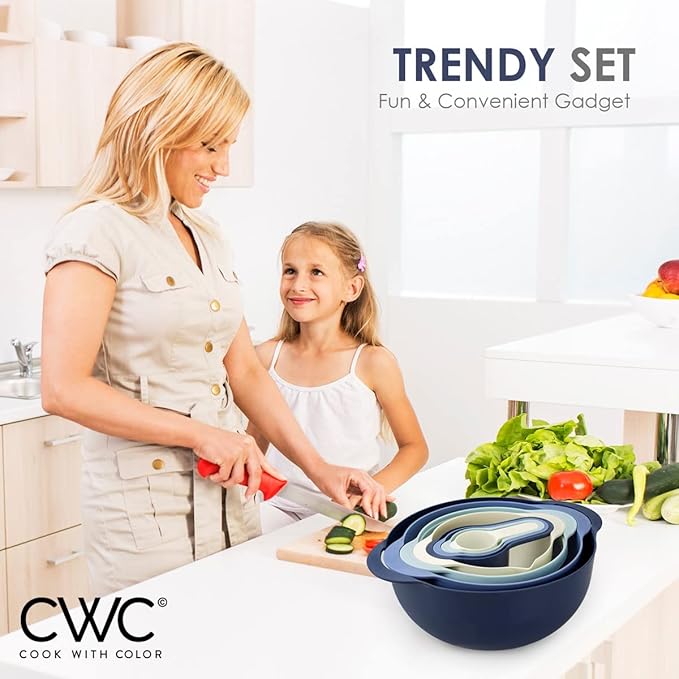 About This Set Includes two mixing bowls (insert size of mixing bowls), one colander/strainer, one fine-mesh sieve/sifter, and four measuring... Read more