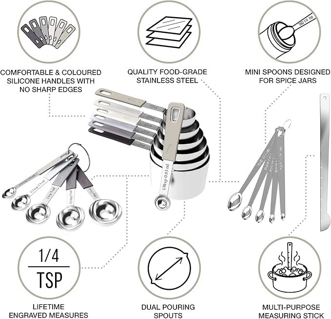22-Piece Stainless Steel Measuring Cups and Spoons Set, Tad Dash Pinch Smidgen Drop Mini Measuring Spoons, Measuring Stick Leveler, Measurement Conversion Chart Fridge Magnet, (Charcoal)