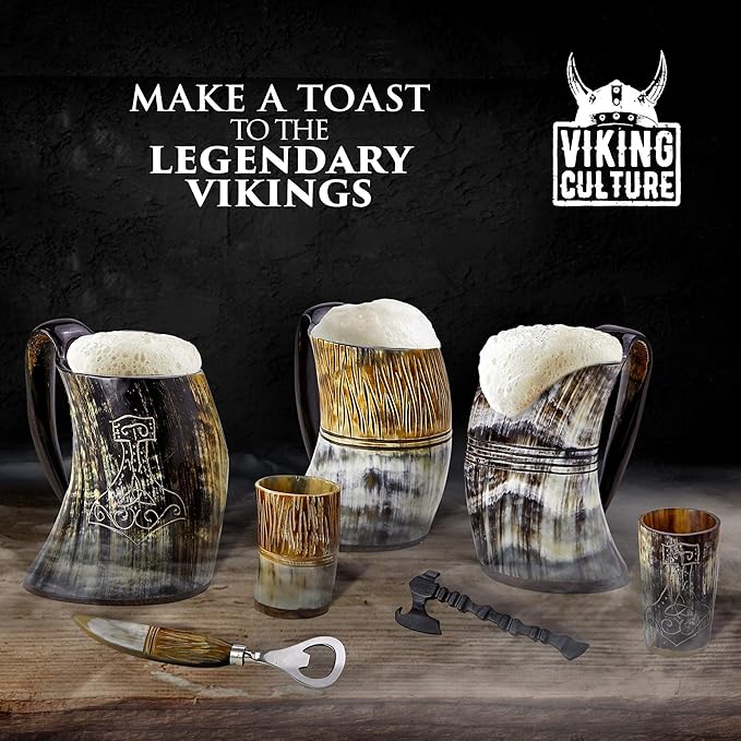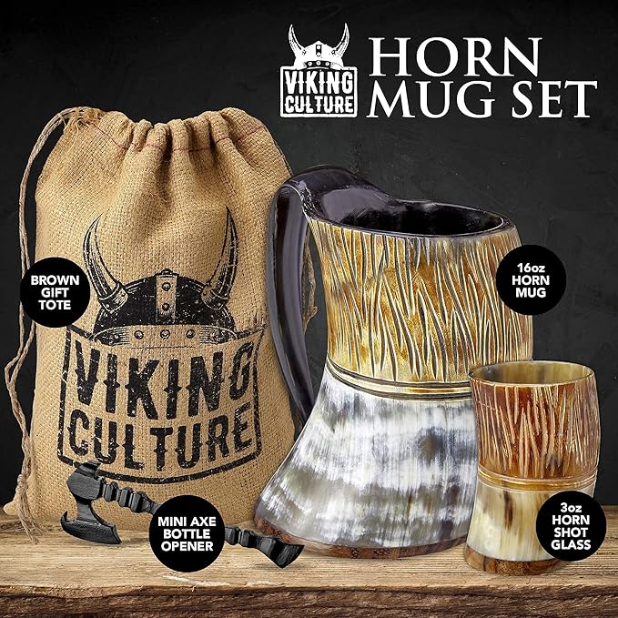 Viking Culture Ox Horn Mug, Shot Glass, and Axe Bottle Opener (3 Pc. Set) Authentic 16-oz. Ale, Mead, and Beer Tankard | Vintage Stein with Handle | Custom Intricate Design - Natural Finish | The Jarl