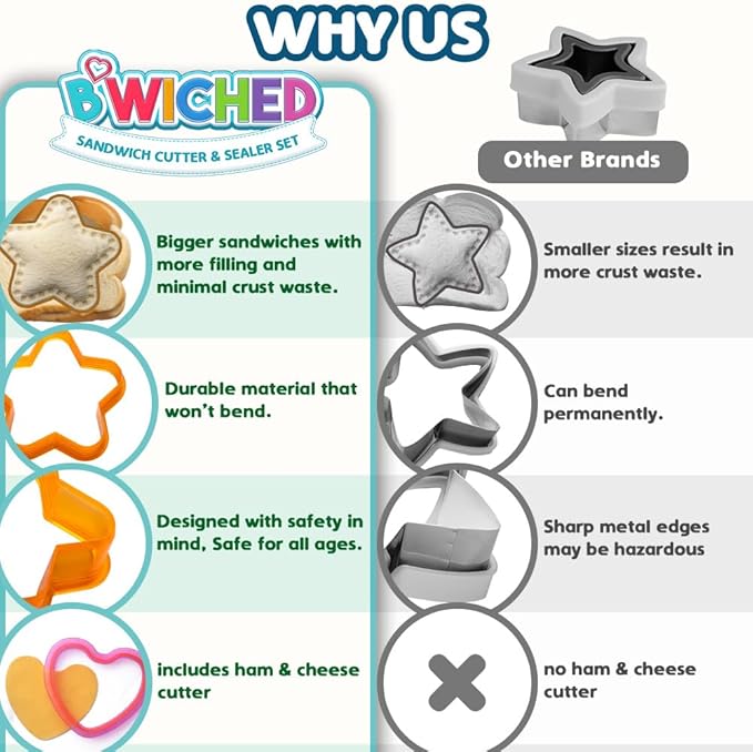 About This PATENTED DESIGN FOR SEALED SANDWICHES: Create fresh, crustless sandwiches in seconds using our sandwich cutter and sealer. The... Read more
