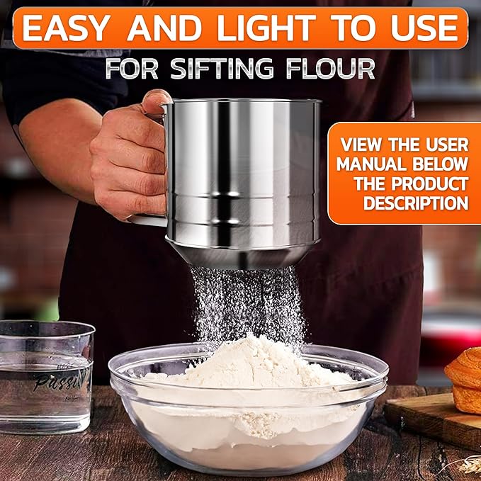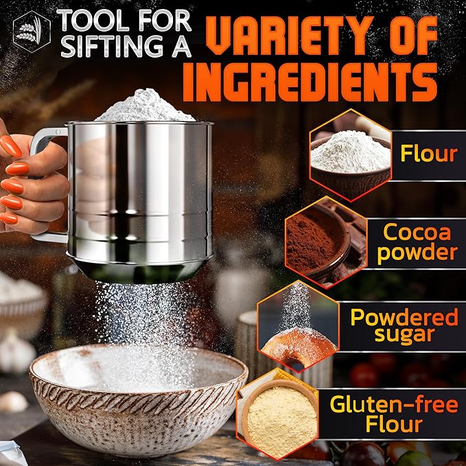 About This Large 5-Cup Baking Sifter: Spacious 5-cup powdered sugar sifter handles more ingredients at once, saving time on recipes.... Read more