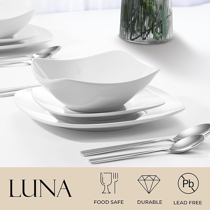 Zulay Kitchen Luna Plates and Bowls Sets, 16 Piece Modern Porcelain Dish Set for 4, Chip and Scratch Resistant Square Dinnerware Set, Microwave and Dishwasher Safe, Pearl White