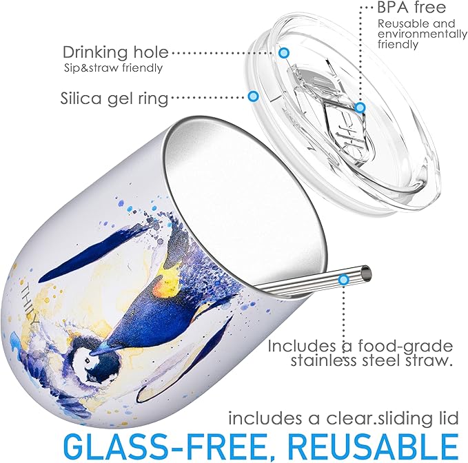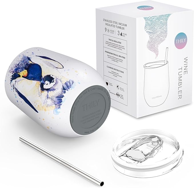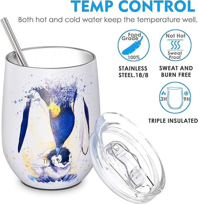 THILY Wine Tumbler Stainless Steel Insulated Stemless Wine Glass with Lid and Straw, Cute Cup Keep Cold for Coffee, Cocktails, Special Collection, Penguin