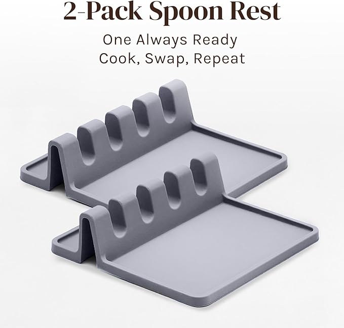 Silicone Spoon Rest for Stove Top with Drip Pad (2 Pack) - Heat Resistant BPA Free Utensil Rest & Kitchen Spoon Holder for Kitchen Counter - Grill Countertop - Spatula Holder, Tongs, Ladle - Gray