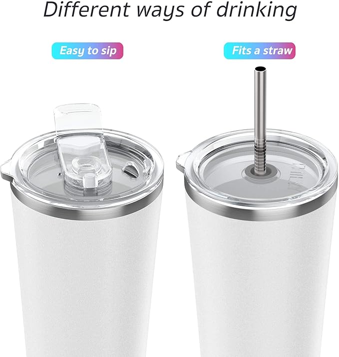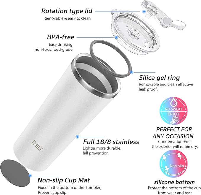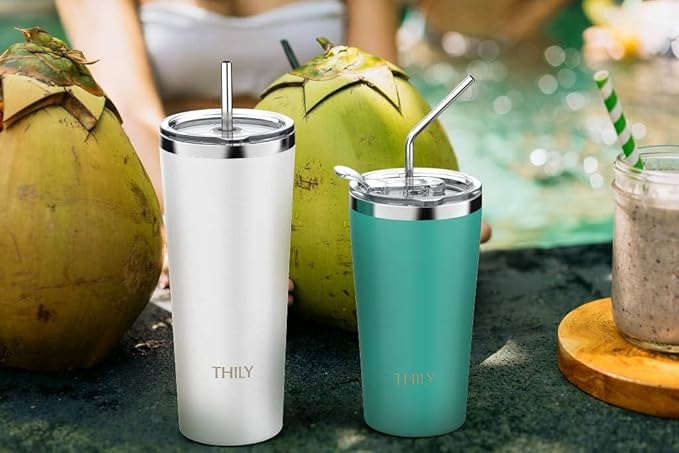 THILY Vacuum Insulated Tumbler Stainless Steel 26 oz Coffee Cup with 2 Lids and Straws, Powder Coated Travel Mug, Keeps Ice Drinks Cold, White