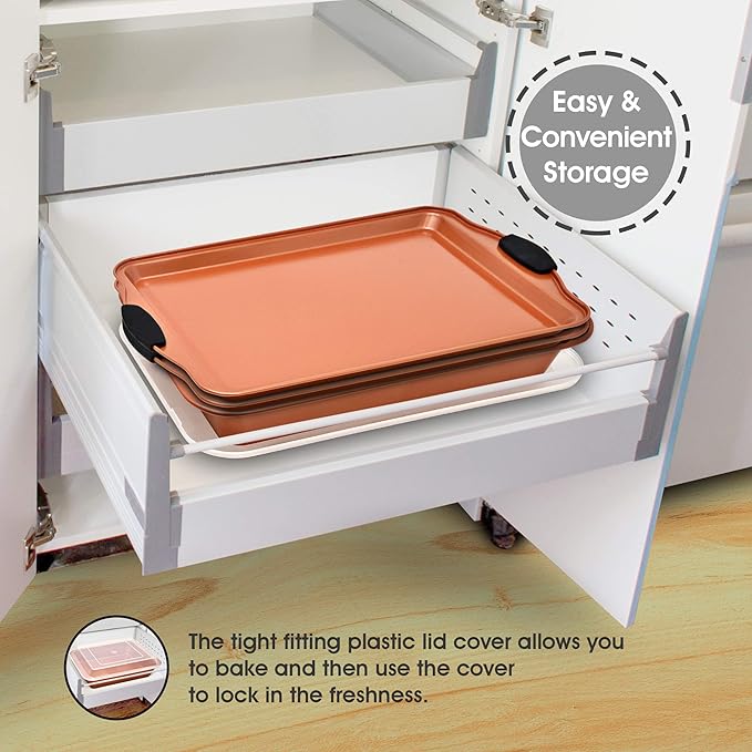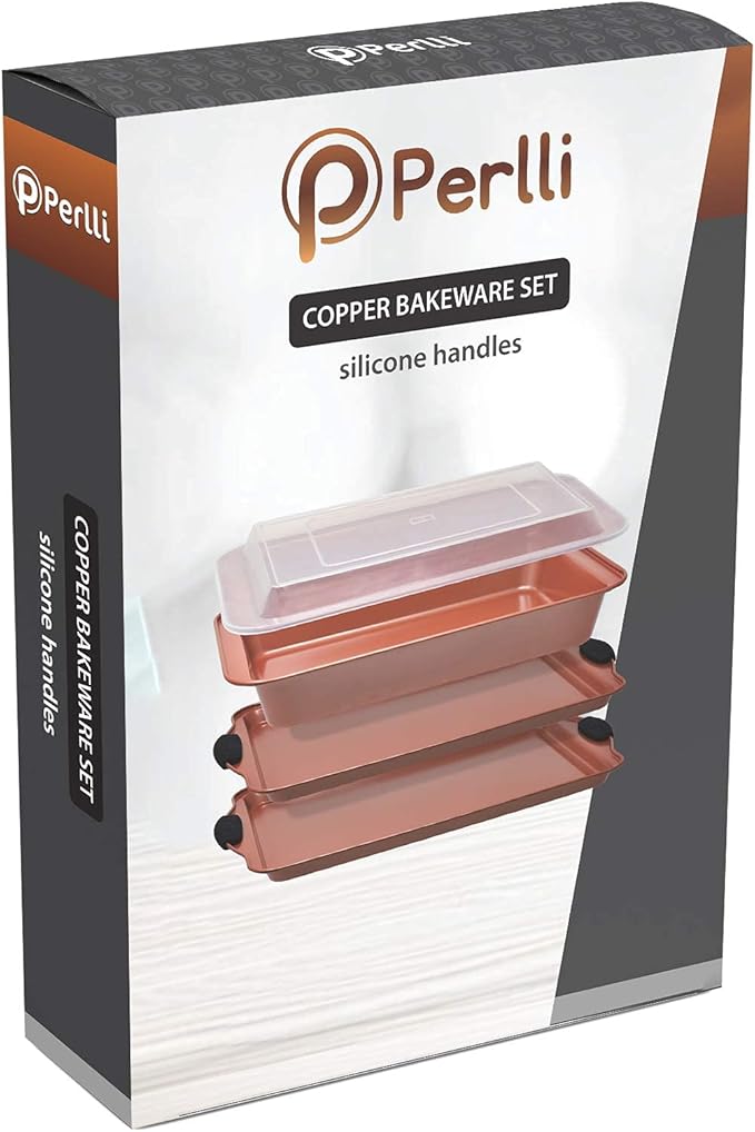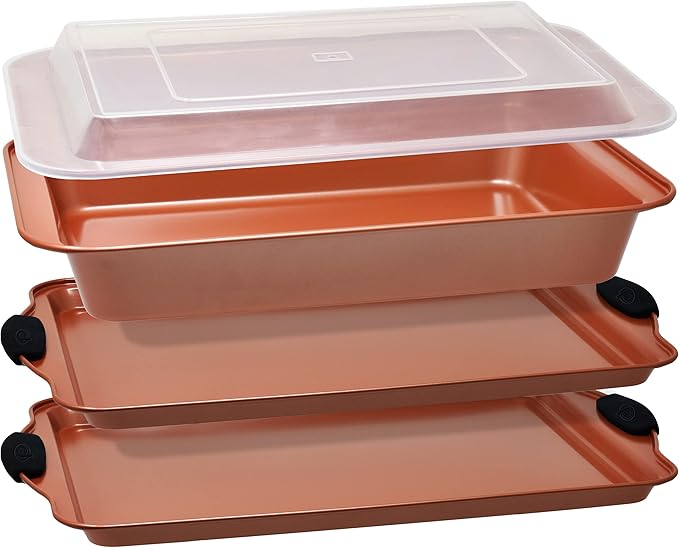 Perlli Baking Sheet 4 Piece Set Nonstick Copper Carbon Steel Oven Bakeware Kitchen Set with Silicone Grips, Includes 2x 9x13" Cookie Sheets, 9x13" Baking Pan with Plastic Lid