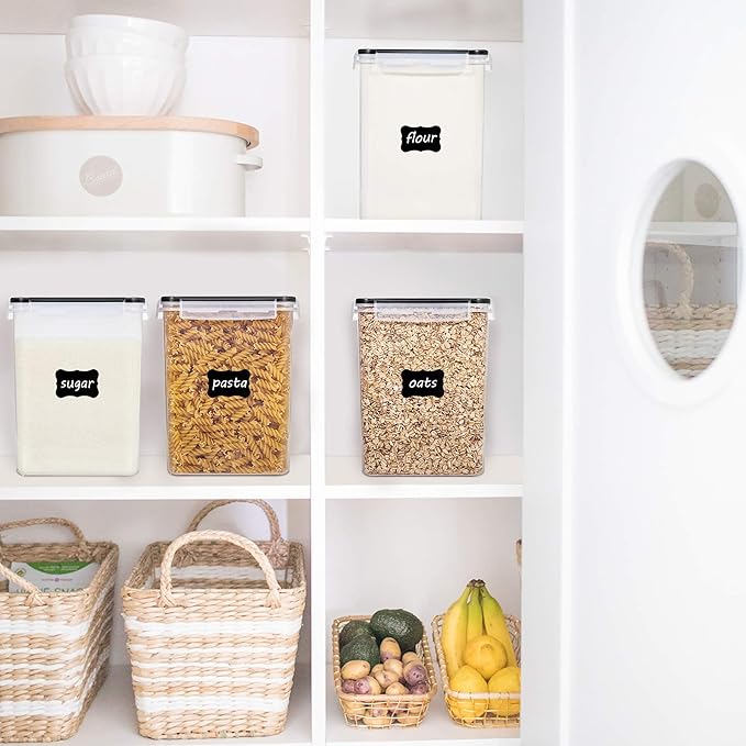 Vtopmart 4 PCS Large Food Storage Containers 5.2L / 175oz, 4 Pieces BPA Free Plastic Airtight Canisters for Flour, Sugar, Baking Supplies, Rice with Lids, 4 Measuring Cups and 24 Labels, Black