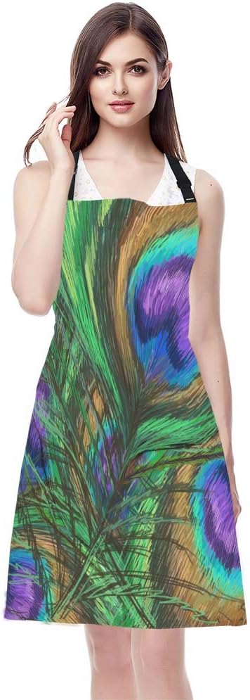 EKOBLA Peacock Feathers Aprons Animal Beautiful Colorful Digital Paint Shiny Green Purple Waterproof Resistant Chef Cooking Kitchen BBQ Adjustable Aprons for Women Men 27x31 Inch