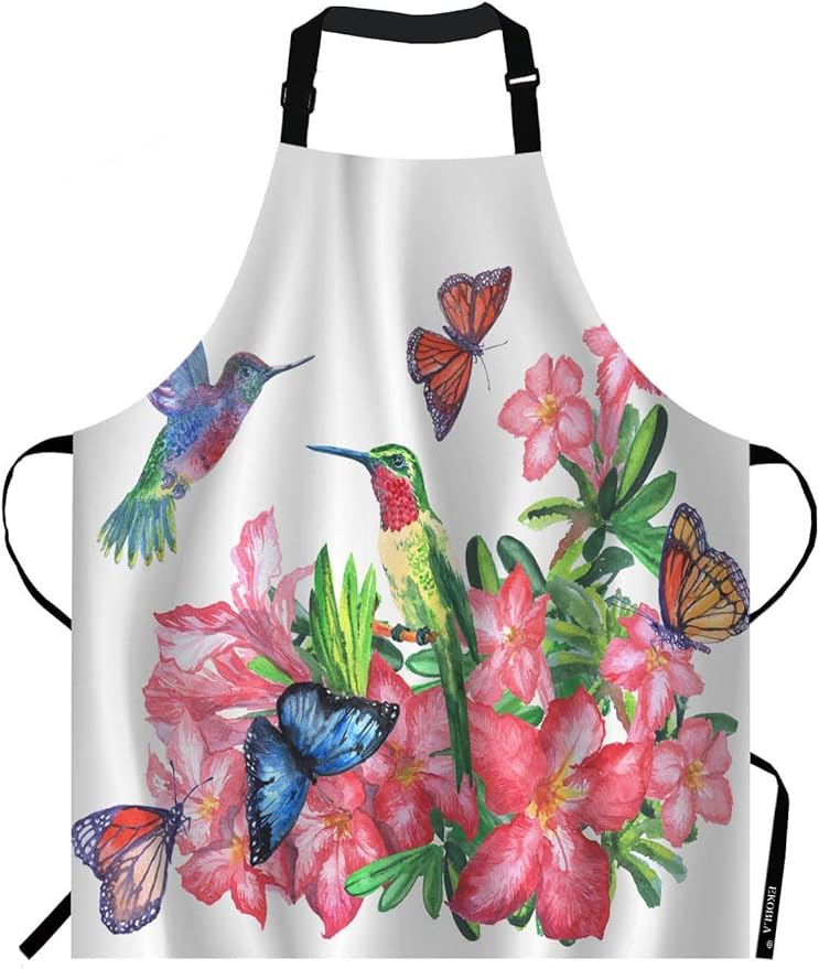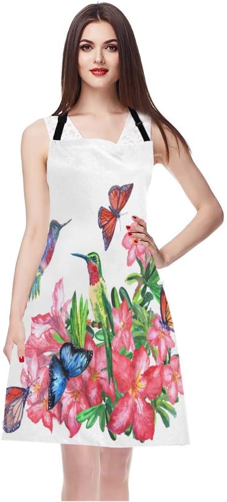 EKOBLA Hummingbirds Aprons Watercolor Painting Butterflies Blossoming Flowers Colorful Waterproof Resistant Chef Cooking Kitchen BBQ Adjustable Aprons for Women Men 27x31 Inch