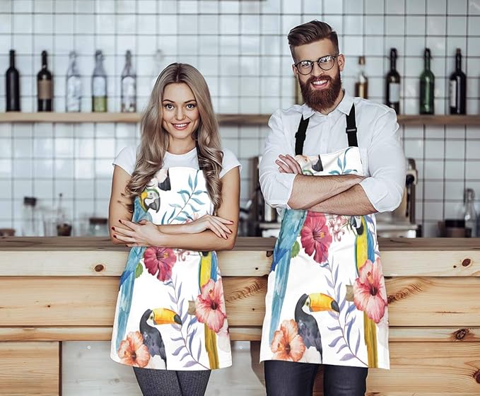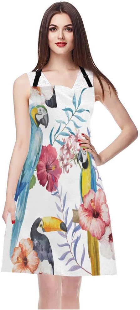 EKOBLA Bird Aprons Watercolor Flower Print Animal Parrot Branches Beautiful Summer Plant Waterproof Resistant Chef Cooking Kitchen BBQ Adjustable Aprons for Women Men 27x31 Inch