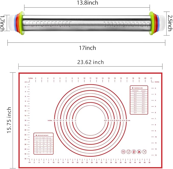 Stainless Steel Rolling Pin and Silicone Mat Set, Adjustable Thickness Rings - For Baking Dough, Pizza, Pies, Pastries, Pasta, Cookies
