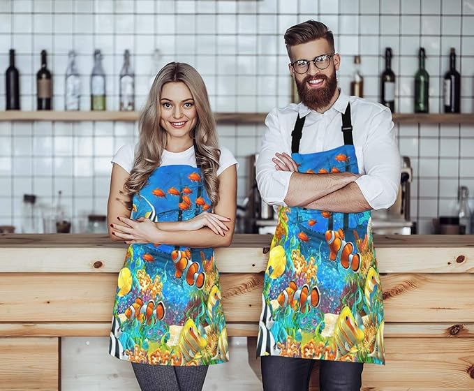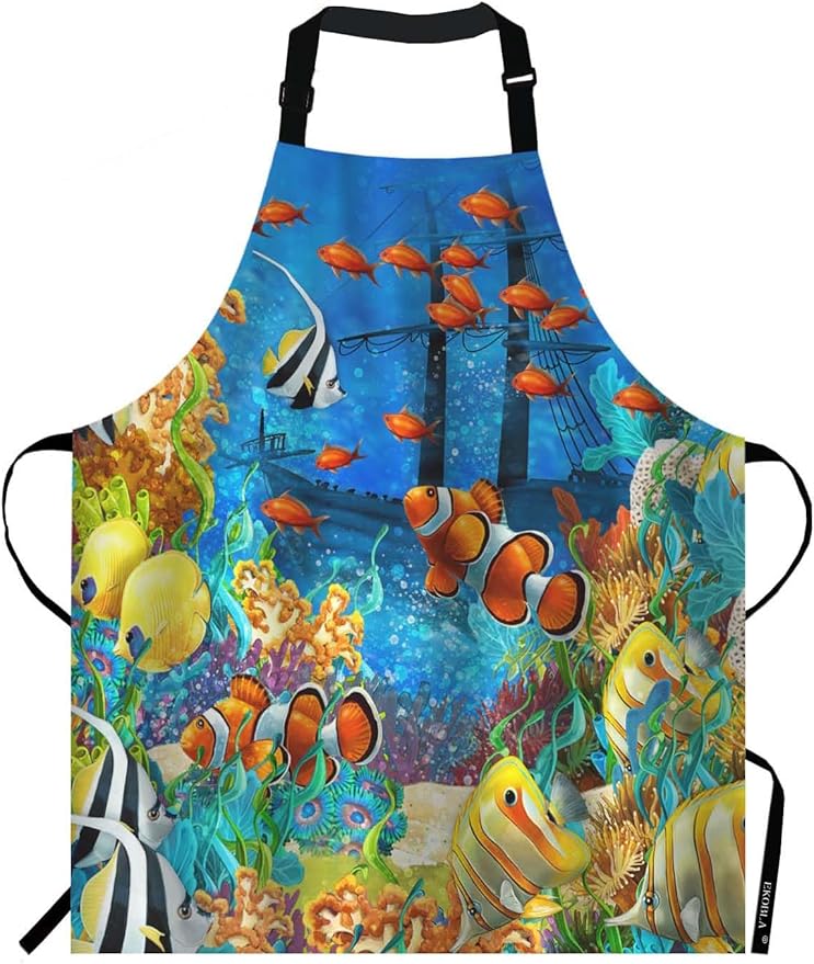 EKOBLA Fish Aprons Painting Undersea Coral Reef Bubbles Colorful Dive Exploration Ocean Waterproof Resistant Chef Cooking Kitchen BBQ Adjustable Aprons for Women Men 27x31 Inch